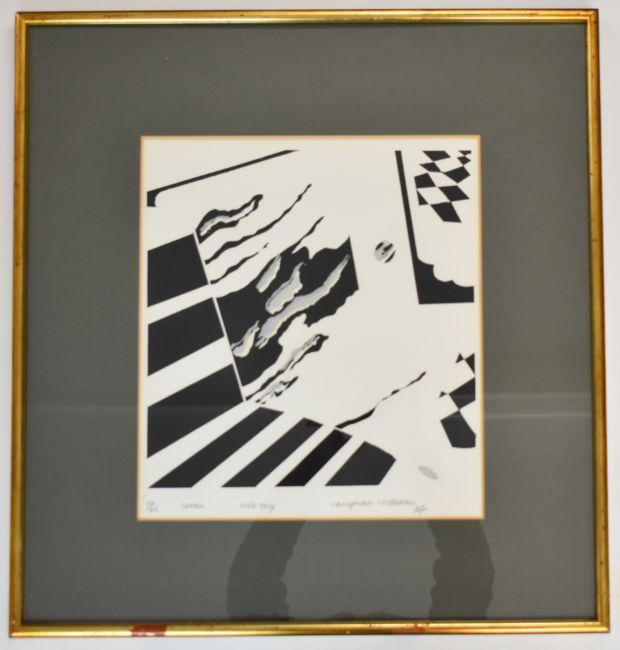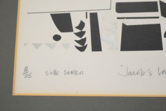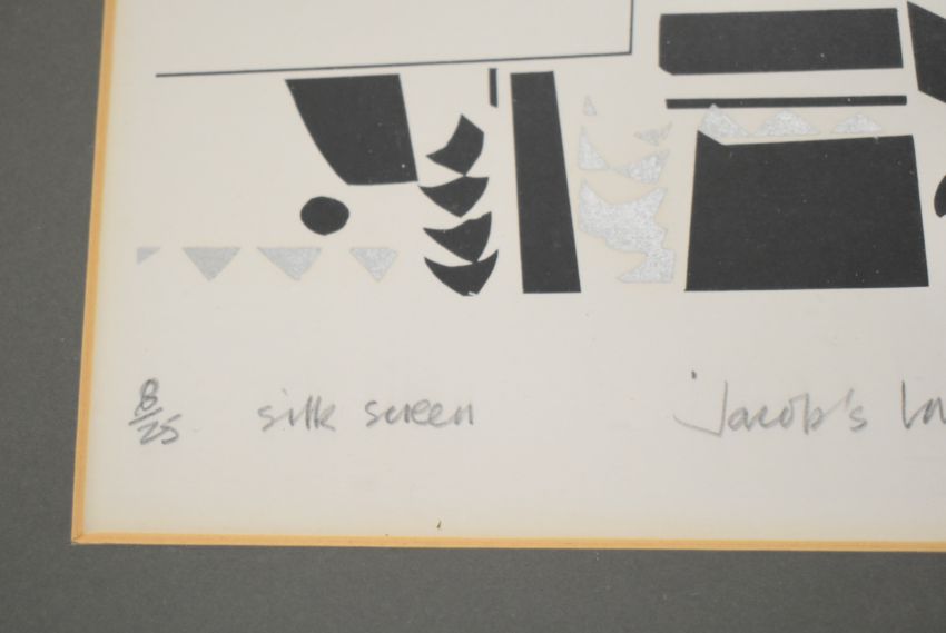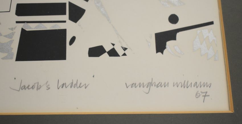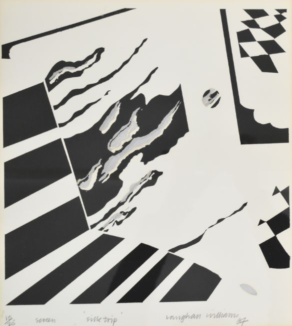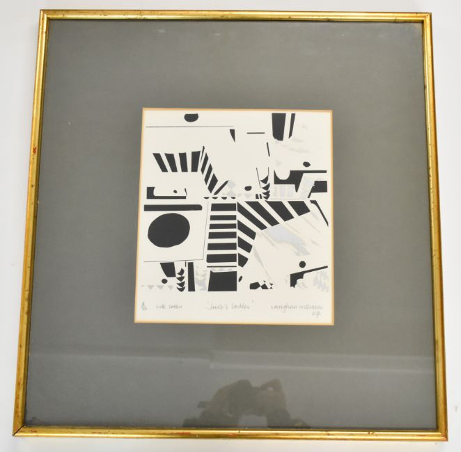 Two mid century modern abstract graphic limited edition screen prints Jacob's Ladder 8/25 and Silk Trip 10/25, both signed Vaughan Williams, largest 39 x 34cm