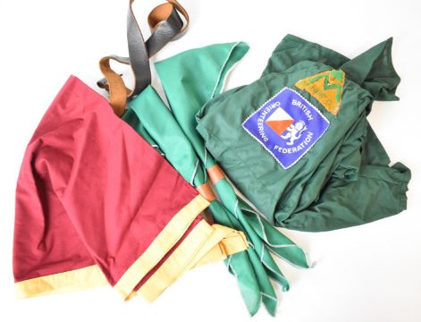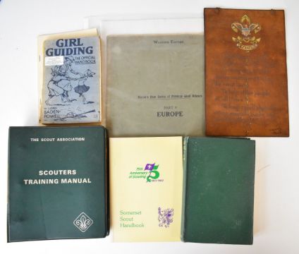 Vintage Scouting memorabilia to include souvenir jamboree pennants for Sutton Coldfield 1957, Bath 1959, Soapbox Derby 1956 and Yorks Wood 1957, medals and pin badges, approximately 300 cloth patches mostly Scouting with county badges etc, vintage clothing shirts, berets, commemorative neckerchiefs. B.P.’s (Baden-Powell’s) Family In Picture And Story Record Book 193, Third World Rover Scout Moot (souvenir book) Scotland July 15-29 1939, The Scout Weekly issue for October 1928, Baden-Powell by Kiernan 1939, several part filled notebooks entries through 1939 of the 23rd Barking (Pathfinders) Scout Troop war log, Saint Patrick’s Rover Crew 1939/40, Scouting Training Manual, Girl Guiding by Lord Baden-Powell of Gilwell 1941, Boy Scouts of America framed certificate 1932, a leather-tooled Boy Scouts oath plaque/banner (c.1930s) The Hackney Scout Song Book 1931, pocket Bible and linen maps etc