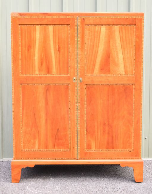 J.D. Gamlen of Exmouth Arts and Crafts style bespoke cherry wood linen press or cupboard, the twin doors and all five drawers having inlaid decoration, the left hand door marked with maker's stamp, W106 x D51 x H140cm