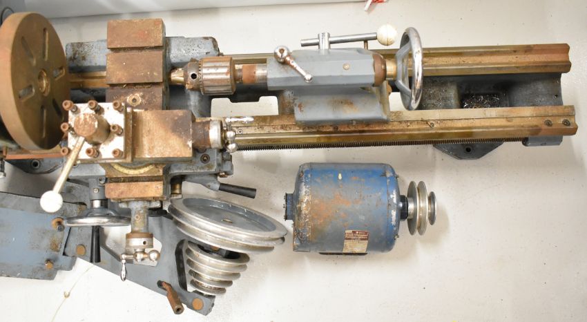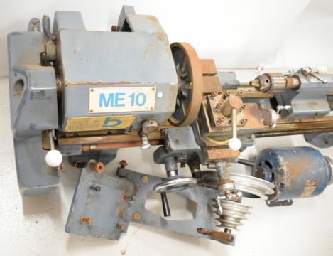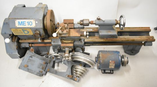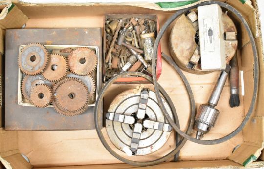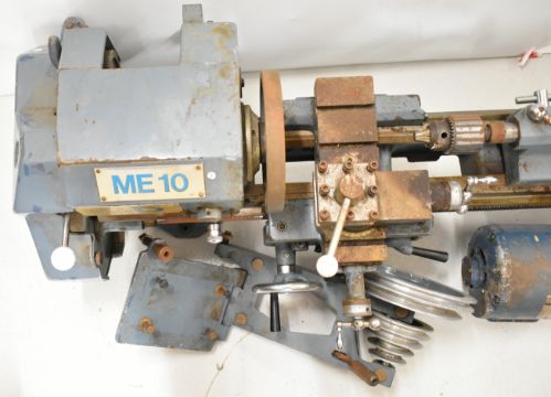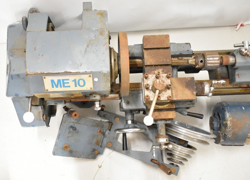 Boxford ME10 model engineering or similar lathe, with three and four jaw chucks, faceplate, various gears for the screw thread cutting function, tailstock chucks and the single phase motor, overall length of lathe 117cm
