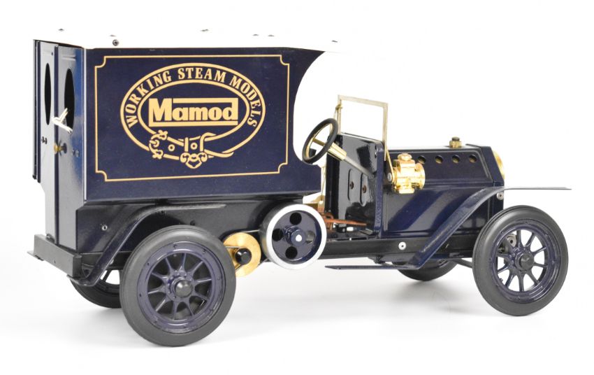 Mamod DV2 live steam model delivery van with reversing single oscillating cylinder and blue Mamod liveried body, length 39cm, in original box