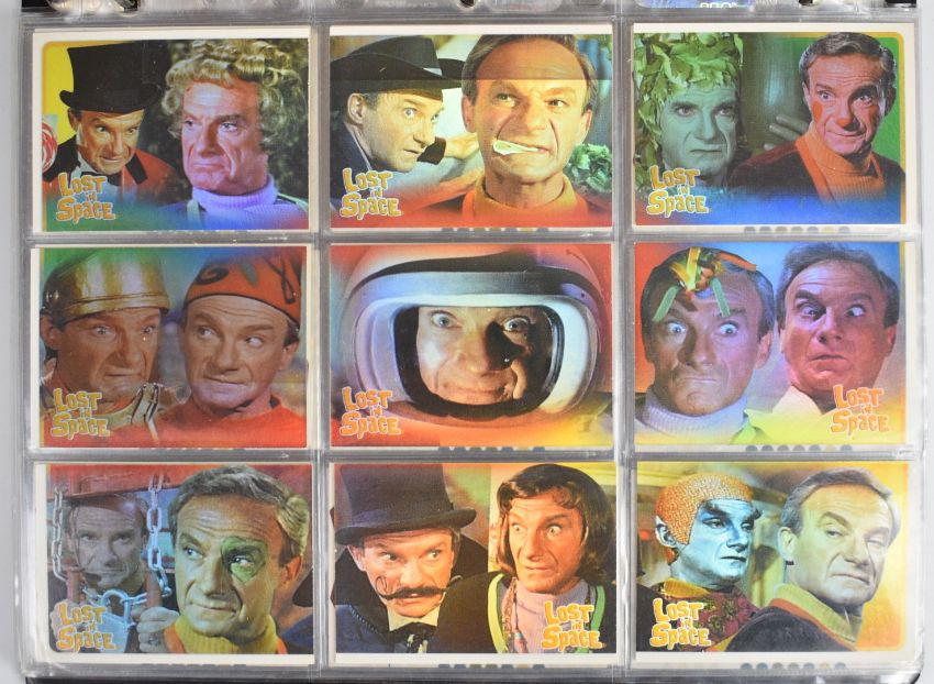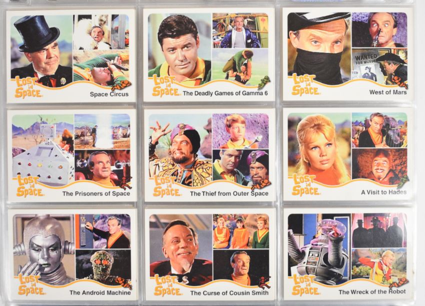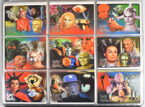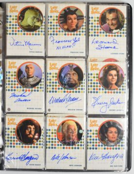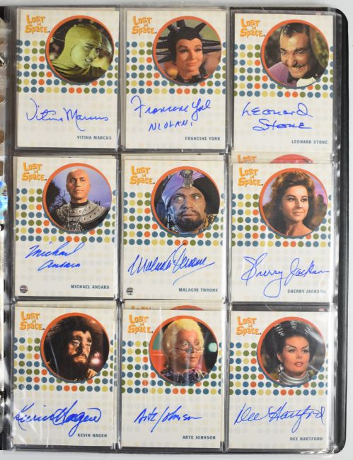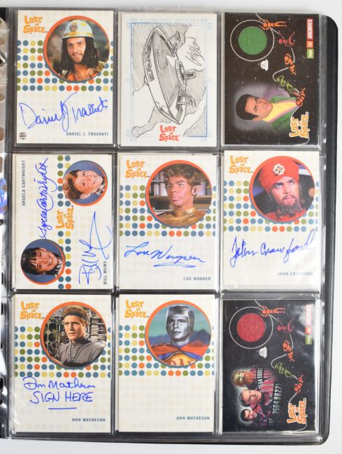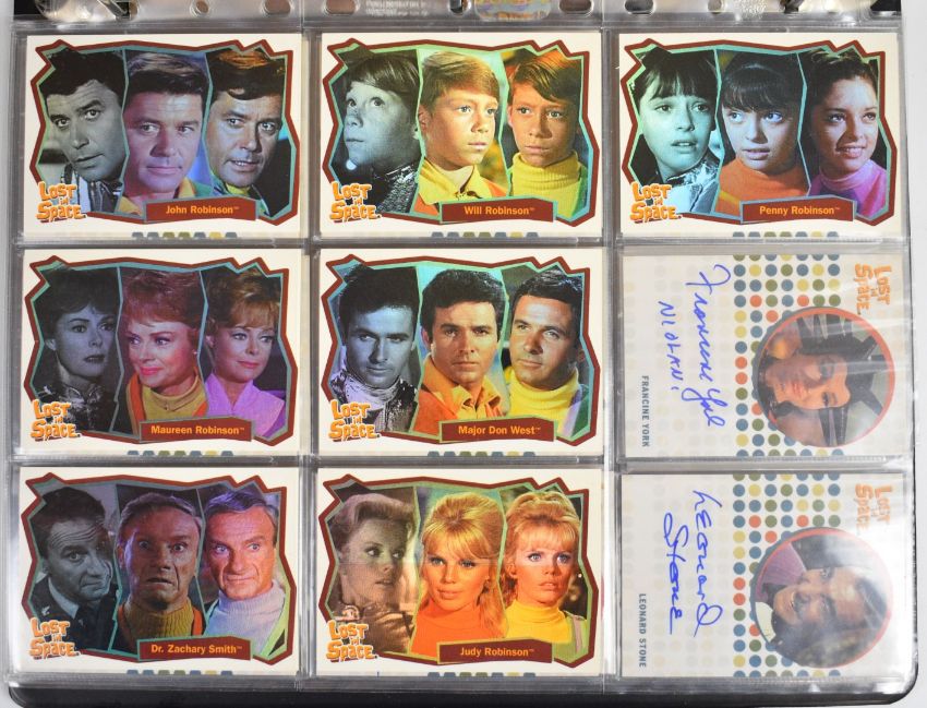 Lost In Space trading cards by Rittenhouse Archives and Topps comprising complete and near complete base sets, bonus foil sets and twenty one chase cards including screen worn costume material, hand drawn SketchaFEX and signatures for Angela Cartwright, Bill Mumy, Mark Goddard, Marta Haisten, Don Matherson, John Crawford, Arte Johnson, Francine York, Leonards Stone and others, housed in an official binder, total card count 214.
