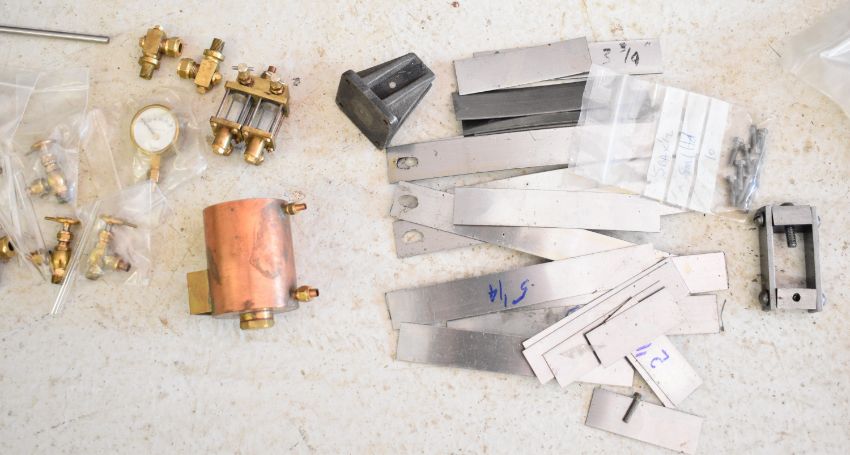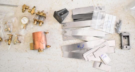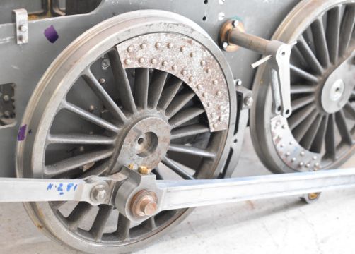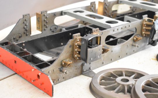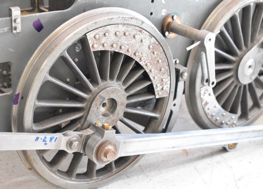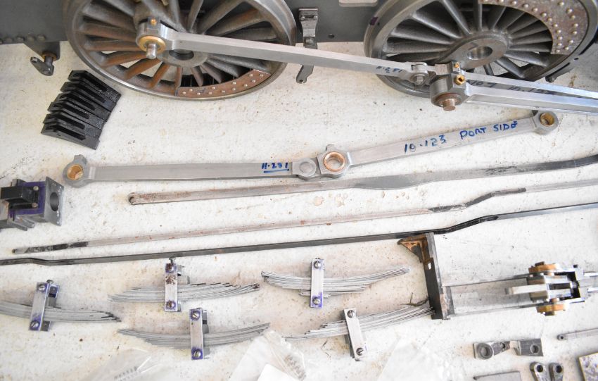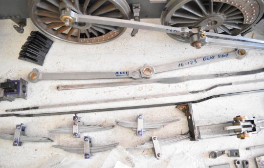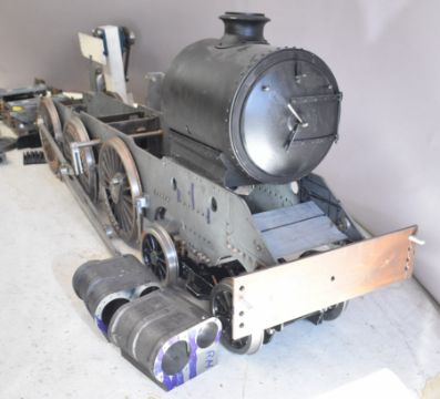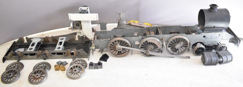 Part built exhibition standard 7¼ inch gauge Martin Evans Highlander 4-6-0 Black 5 live steam tender locomotive, to include chassis, axles, wheels, front bogie, smokebox, water pumps with eccentrics, reverser, connecting and coupling rods, brake cylinder, brake gear including shoes, tender chassis, wheels, steam fittings including 0-150 psi pressure gauge and lubricator sight glasses and a pair of rotating build stands. This having been one of a pair that the vendor's late husband was mid build