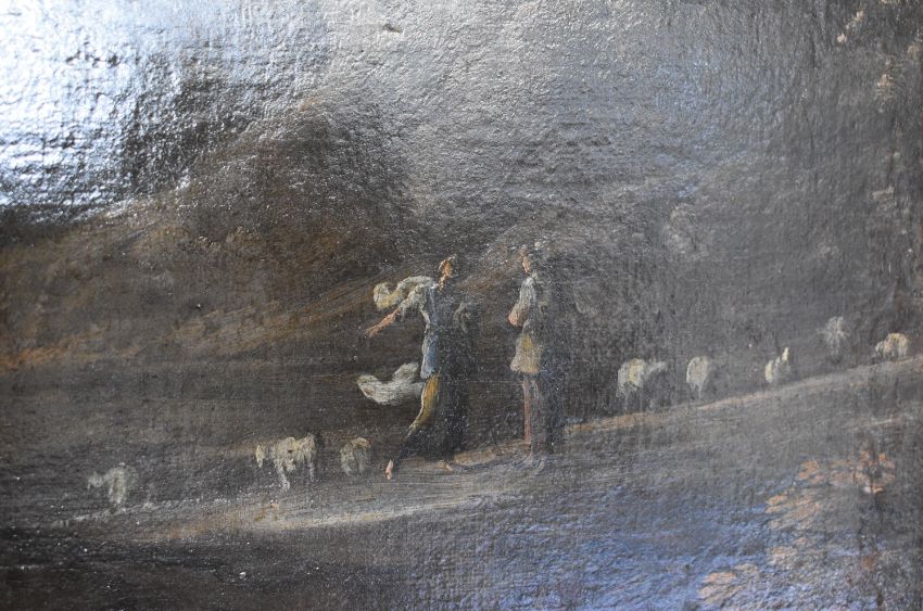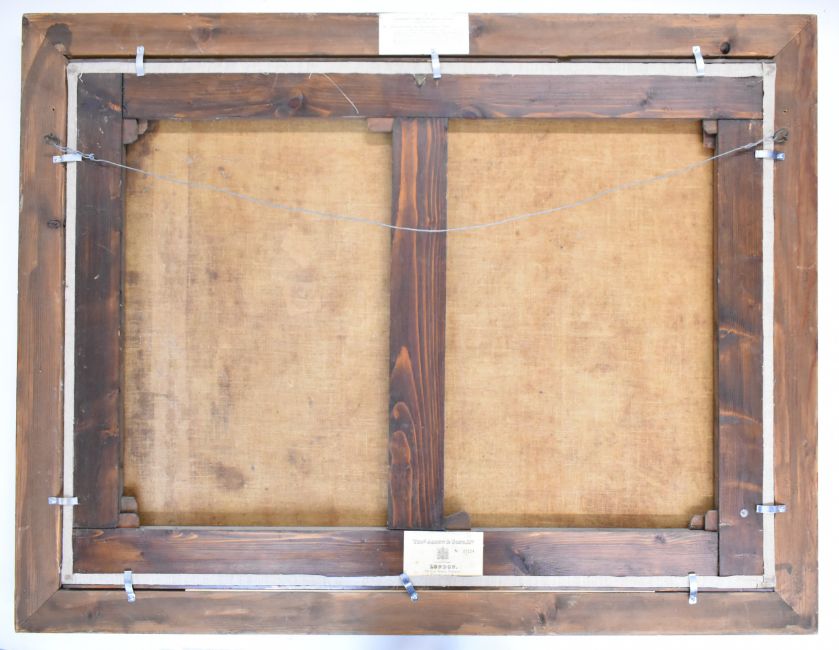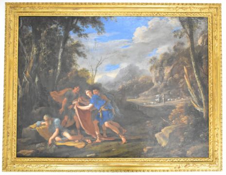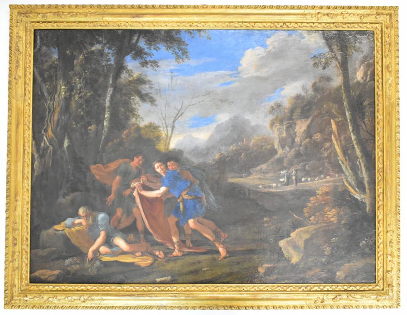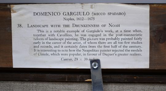 Domenico Garguilo or Micco Spadaro (Italian 1609-1675) attributed Landscape with The Drunkenness of Noah with figures in a landscape, exhibition labels verso, 72 x 98cm, in gilt frame. Formerly the property of Mr and Mrs Charles Robertson, Mrs Robertson a member of the Fry's Chocolate family and Mr Robertson of Robertson's Jam, with a letter dated 1989 from Christopher R Marshall, University of Melbourne, thanking the Robertsons for allowing him to view the painting and commenting on its quality, and also a letter to Mrs Robertson from Thomas Agnew and Sons Ltd mentioning the picture as no 38 in an exhibition, and a price of £1500 in 1966..