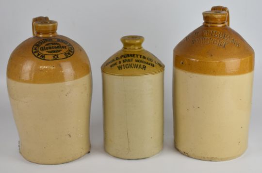 Three stoneware flagons / jars for Arnold Perrett, Wickwar; Washbourn Brothers, Gloucester and W H Williams, Newport, tallest 25cm