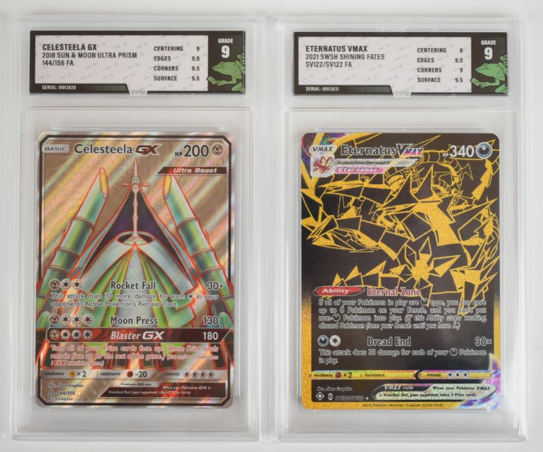 Pokémon TCG - Celesteela GX 2021 Ultra Prism 144/156 and Eternatus Vmax 2021 Shining Fates SV122/SV122, both graded 9 by Tree Frog Grading and presented slabbed in archival capsules.