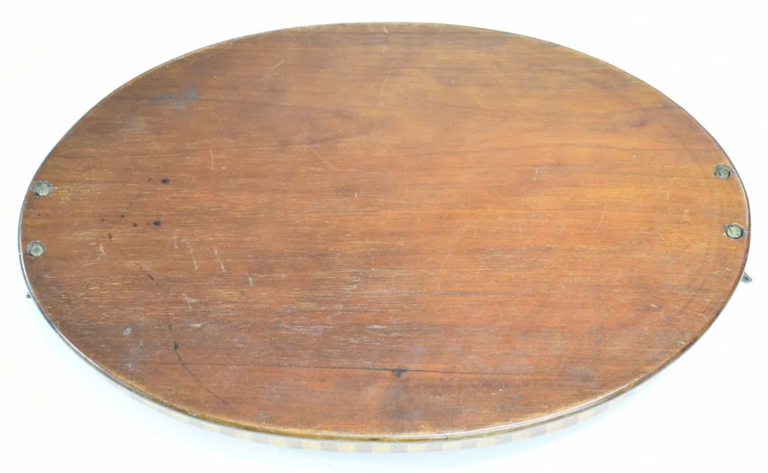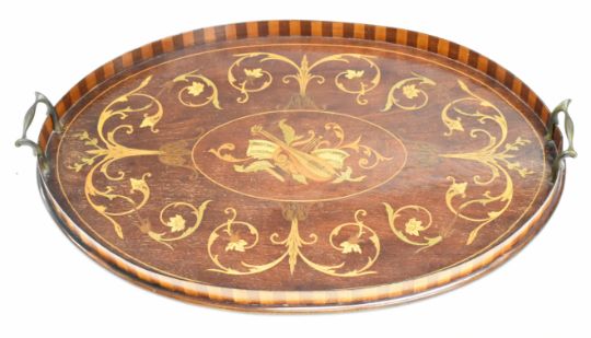 Edwardian inlaid mahogany twin handled tray with mandolin / musical decoration, W57 x 39cm