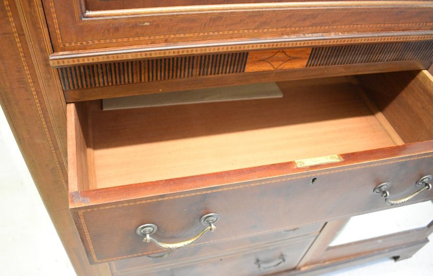 19th or early 20th century mahogany compactum fitted four drawers and single cupboard with shelves to the central section, the two mirrored doors opening to reveal hanging spaces to both sides, the right hand side with a single drawer to base, W187 x D54 x H228cm