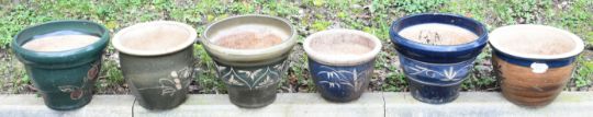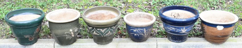 Six coloured jardinieres / garden planters with floral decoration, largest D35 x H28cm