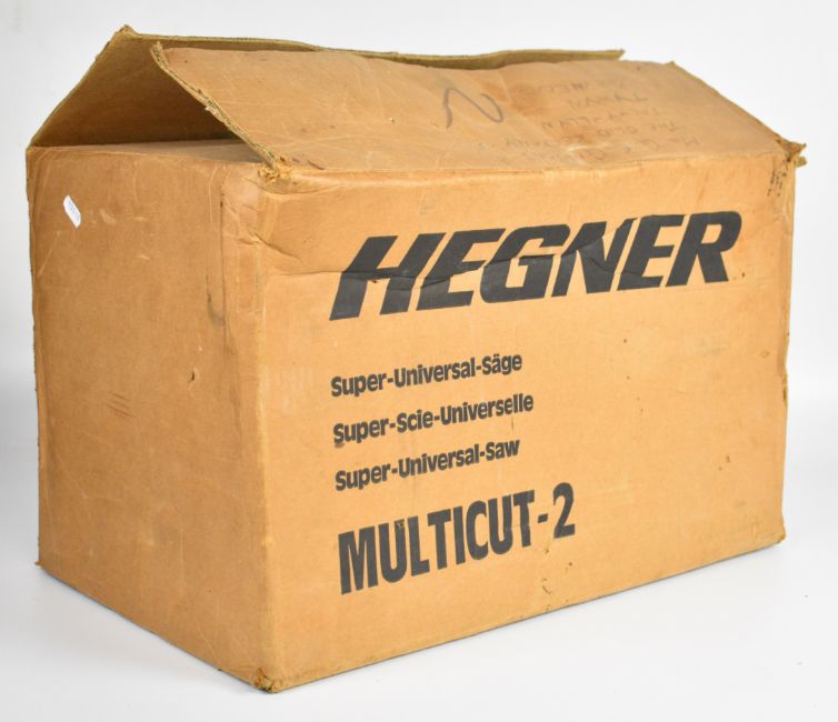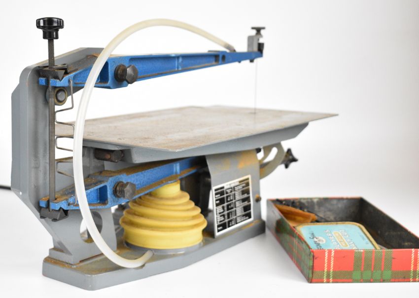 Hegner fretsaw with replacement steel table added by the vendor for cutting metal so the swarf doesn't dig in, in original box
