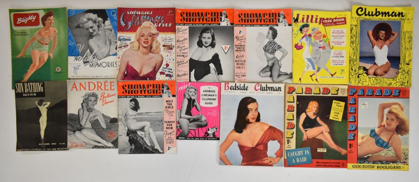 [Adult Entertainment] Collection of vintage glamour, erotic and soft porn magazines to include eleven issues of Parade for 1964, Clubman and Bedside Clubman, The Showgirl and Showgirl Glamour Revue, Lilliput 1955, Holiday Memories photographed by Roye, souvenir programmes of Revudeville at the Windmill (Theatre), Andree Britains Venus photographed by Walter Bird, a 1952 issue of Sun Bathing Review (25)