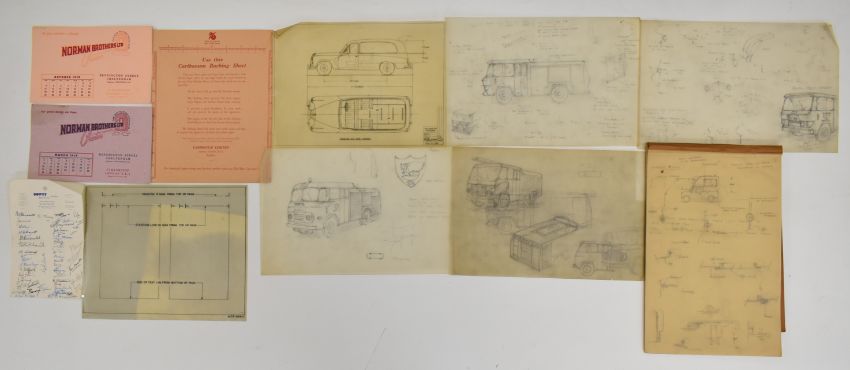 Motoring, commercial vehicle, coachbuilding and similar ephemera and collectables to include Mercedes, Dodge, Rolls Royce and other pins, Institute of Advanced Motorists badges, 1959 Veteran Car Club Cheltenham rally programme and photo album of the event, Wadhams Coachbuilders paperwork and sketches and drawings to include fire engines and hearse, De Havilland letter dated 1955, Mercedes Benz promotional photograph frame, BP and Shell booklets, Motorsport and Autosport magazines, Alfred Miles of Cheltenham fire engine brochures and a Maguire Deutz name badge