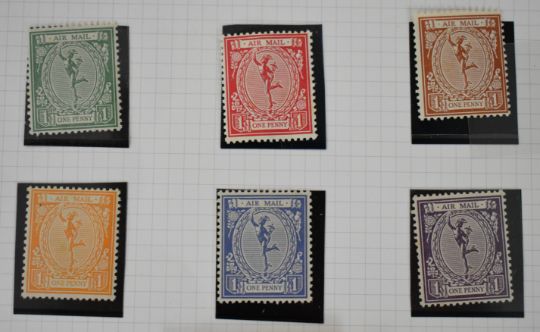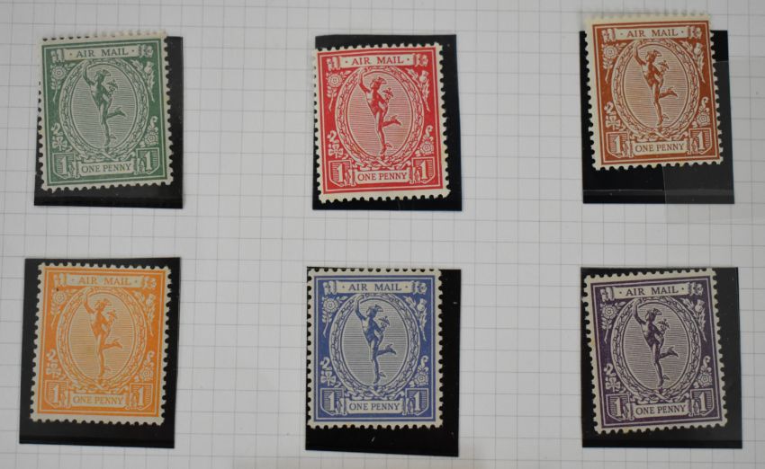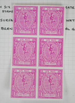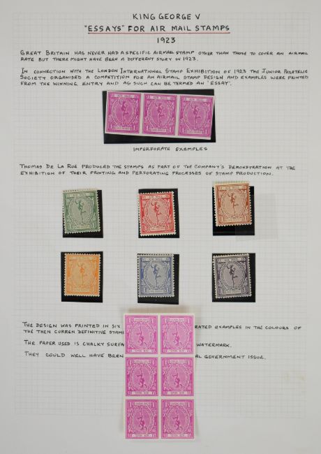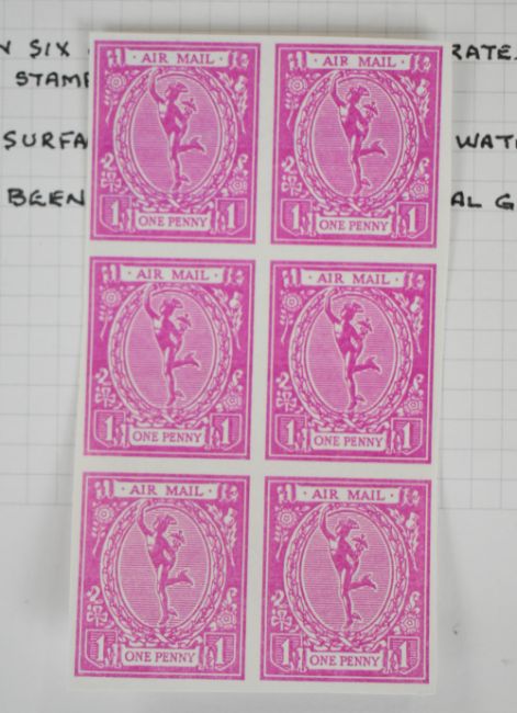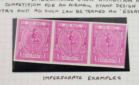 'Essays' for airmail stamps, six perforated 1d stamps in different colours and 1d bright purple imperf stamps in strip of three and block of six produced by Thomas De La Rue for the London International Stamp Exhibition 1923