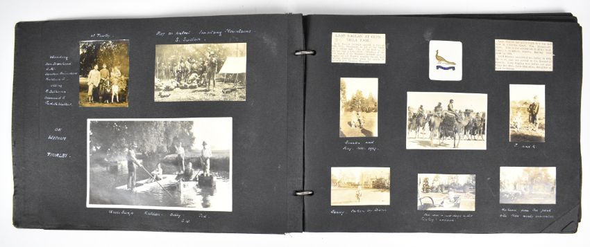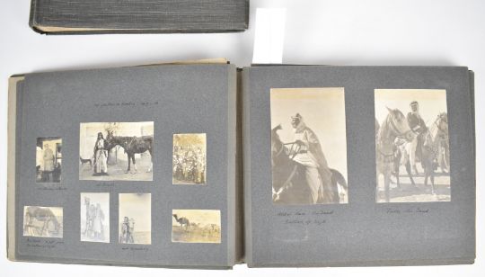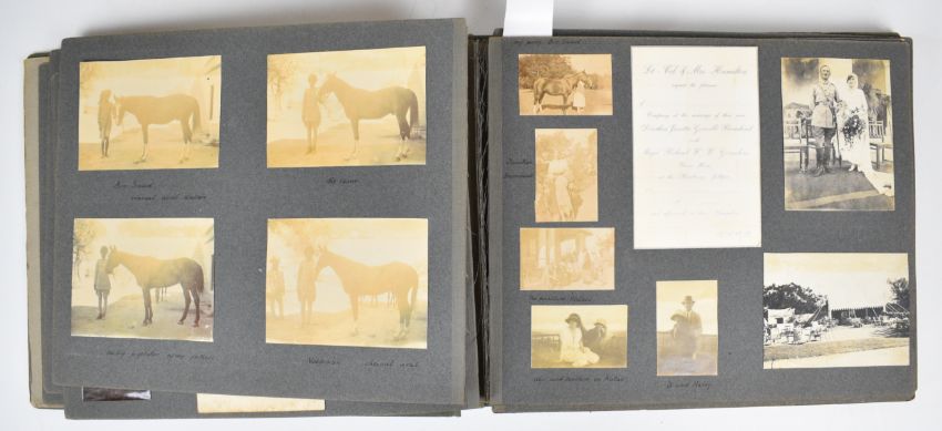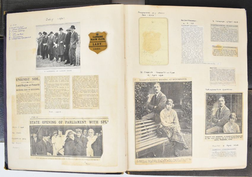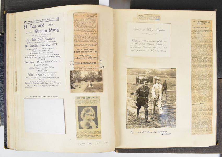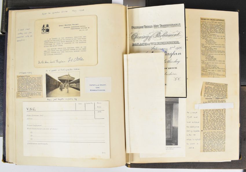 Small archive of early 20th century family photograph albums, letters and many news cuttings of Fitzroy Richard Somerset (Lord Raglan) and The Hon. Julia Hamilton, including their engagement and wedding, children's birth, social invitations, trips abroad both work and pleasure, documenting visits to Raglan and Forbes Castle, Wishaw House, Udny Castle, Cefn Tilla and Thurlby Hall, images from visits to Delhi, Jodhpur, Hong Kong, Arabia and Sudan, tickets of invitation to the opening of Parliament at the Palace of Westminster, record of Christening, Llangibby Hunt and Ball, ski-ing in Saanen, village festivals, Girl Guides, fancy dress party in Gulmarg, Poonch, the Jodhpur polo team, passing out parade at Sandhurst, Great Western Railway printed card in recognition of volunteering after general Railway strike in 1926, Christmas greeting card from The Maharajah of Jodhpur with photograph posing beside the spoils of a kill, Lanark Race Club ‘Lady’ 1921 member badge, Club Enclosure Pass at Monmouthshire Country Race Club 1923 etc and a handwritten account book listing the number of Militamen, Sergeants, Corporals and Privates present or absent with leave in each unit from 1863 to 1902 as collected by Lt. Col. Lord Raglan and Capt. The Hon. G. Somerset from the Parliamentary Returns issued annually, the ledger listing all the different regiments and counties with figures recorded each year  Baron Raglan (1885-1964) soldier, author and amateur anthropologist, married Julia Hamilton in 1923.