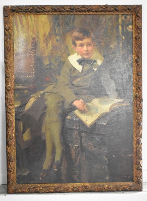 Frank Owen Salisbury (British 1874-1962) Edwardian oil on canvas of a finely dressed young boy, seated on a domed metal bound trunk with an open atlas, signed lower right, entitled to the canvas verso ' The End of His First Term 1908, Willie, Son of HG Treasure esq, Helmlea', 126 x 87cm, in gilt frame