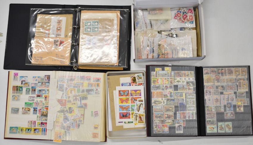 A large collection of world stamps in albums, stockbooks and loose, stockbooks include one of Malawi stamps, mostly used sets to 1990s including miniature sheets, three containing Liechtenstein 1940s to 1980s, Finland with booklet panes, Netherlands booklets, Malaysia and Thailand, Papua New Guinea to 2008. Box of Frama labels and set of 2006 Stamps of the World catalogues