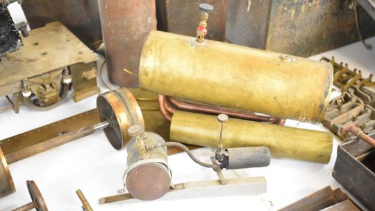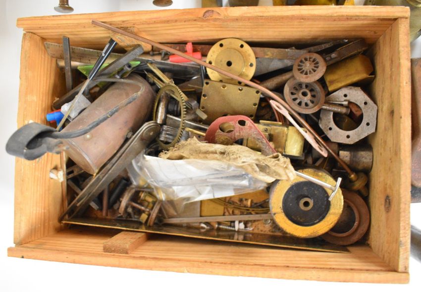 Live steam locomotive and traction engine parts to include a 3½ inch gauge tender chassis, copper boiler, frames, 0 gauge live steam Midland Spinner or similar chassis with single cylinder, Mamod Meccano engine, brass sheet, various castings and parts believed to relate to a 3 inch scale Burrell traction engine including steering gears and parts for a belly tank