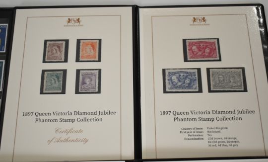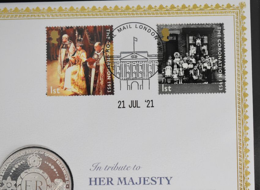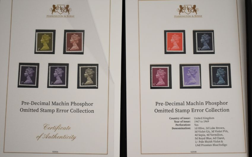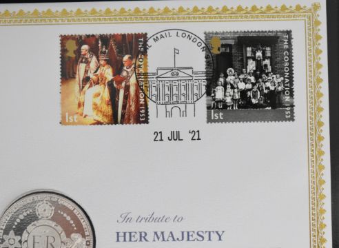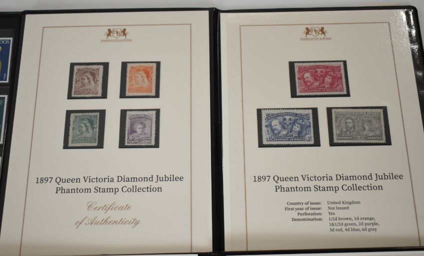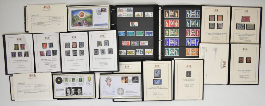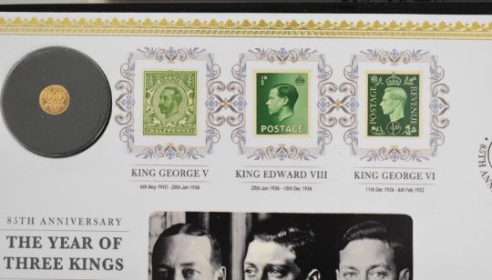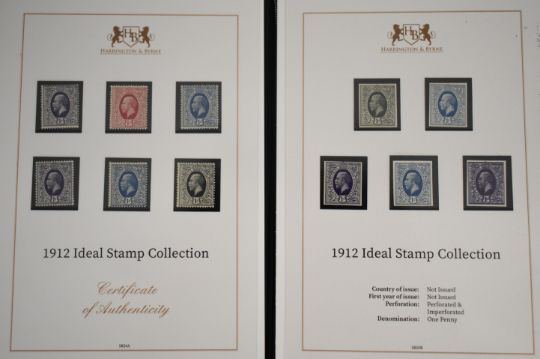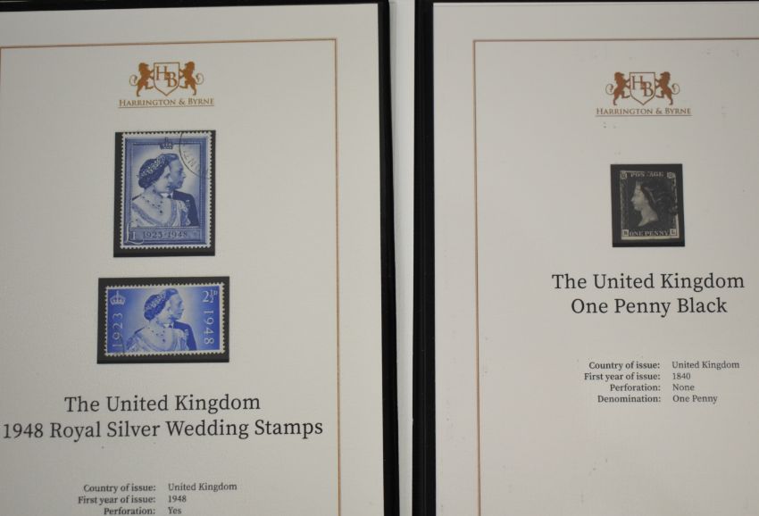 Collection of Harrington & Byrne folders with stamp and coin covers including 2021 Three Kings coin cover with Tristan da Cunha 0.5g fine gold coin, 2021 Tribute to HM Queen Elizabeth II coin cover, 2019 30th Anniversary of Wallace & Gromit coin cover with 925 silver proof 50p, 1897 and 1912 stamp essay sets, 1840 1d black with black Maltese cross and two full and two half margins, also includes two 1870 three halfpence used stamps and 1948 GB Royal Silver Wedding used pair