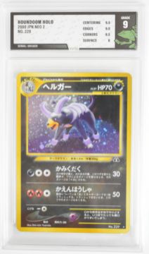 Pokémon TCG - Four Japanese cards from Gym Heroes and Neo Genesis series comprising LT Surge's Fearow 022, Kabutops Holo 141, Houndoom Holo 229 and Houndour Holo 228, grades ranging 7-9 by Tree Frog Grading and presented in slabbed in archival capsules.