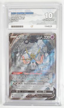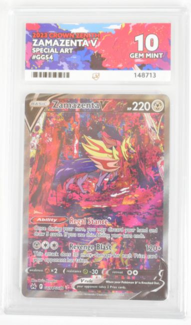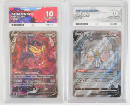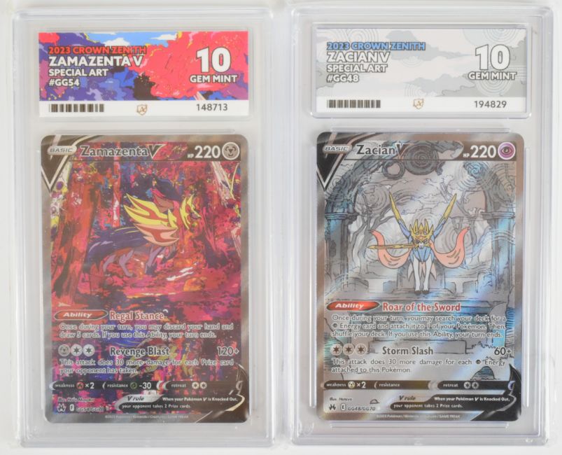 Pokémon TCG - Two Sword & Shield 'Crown Zenith' 2023 special art cards comprising Zalcian V GG48/GG70 and Zamazenta V GG54/GG70, both graded 10 Gem by Ace Grading and presented slabbed in archival capsules.
