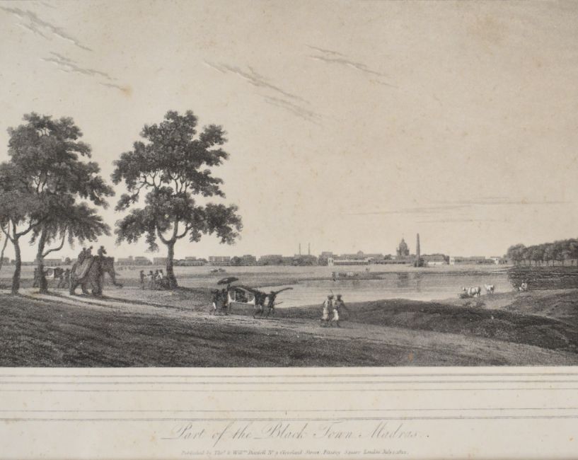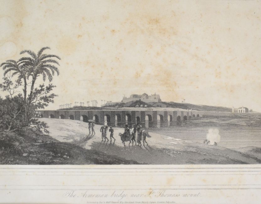 [India] Pair of engravings by Thomas and William Daniell comprising The Armenian Bridge near St. Thomas’s Mount and Port of the Black Town Madras, July 1st 1812, 17 x 25cm framed