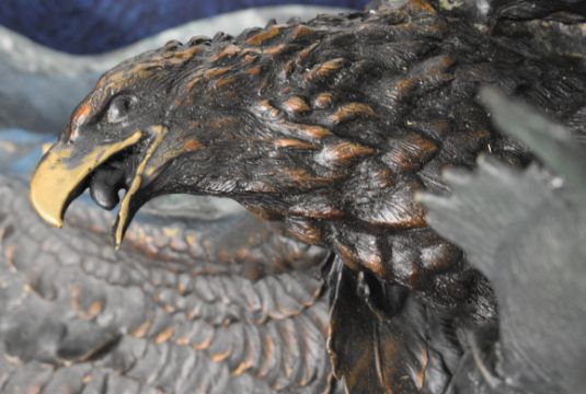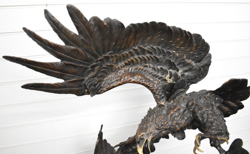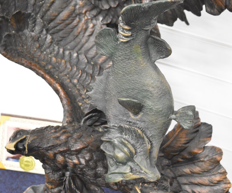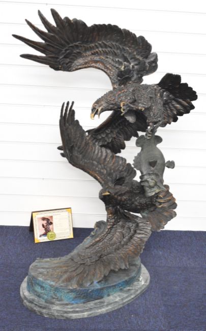 Ed Chope signed limited edition 22/75 large bronze figure of two eagles fighting over a fish, signed 'Chope' to base, raised on a kidney shaped marble base, with certificate of authenticity, H120cm