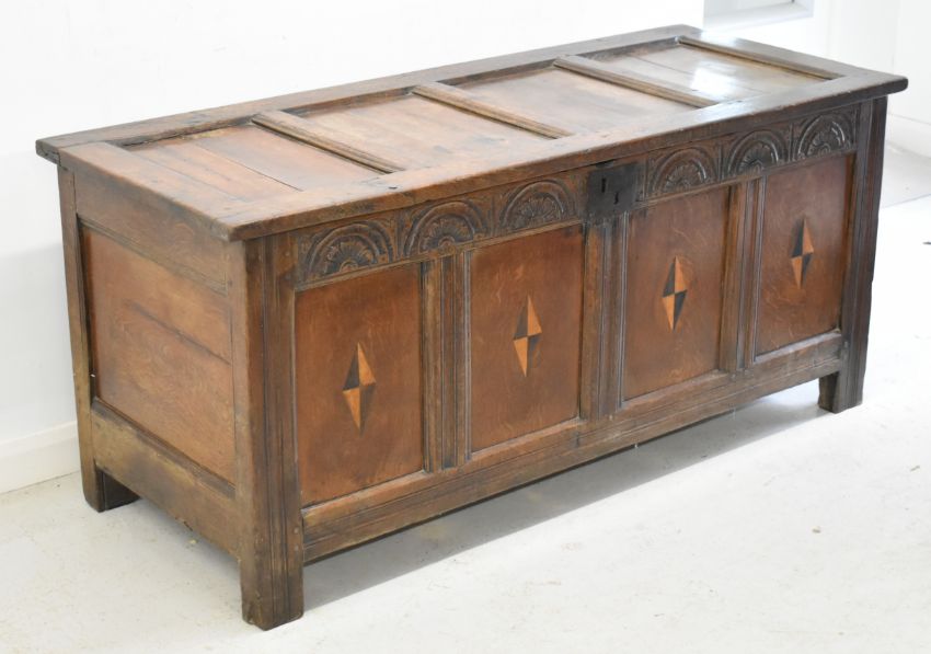 18thC carved and inlaid oak coffer or blanket box, W154 x D63 x H68cm