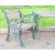 Cast metal and hardwood garden table and two chairs, the table L140 x D68 x H65cm