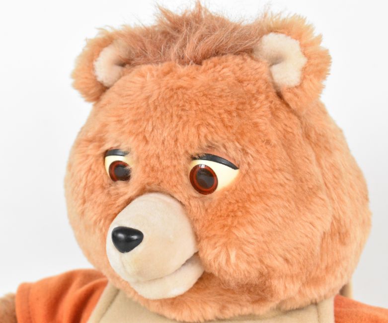 Worlds of Wonder Teddy Ruxpin animated talking bear with audio cassette, 1985, height 35cm sitting.