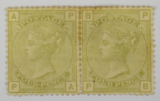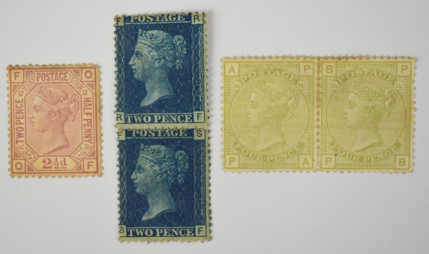 Small selection of mint GB Queen Victoria stamps, comprising pair 1873 4d sage green (SG 153) plate 16 (toned), pair of 1558 2d blue (SG46) plate 14 and 1873 2 ½d (SG141) plate 12.