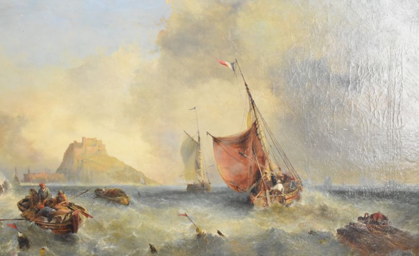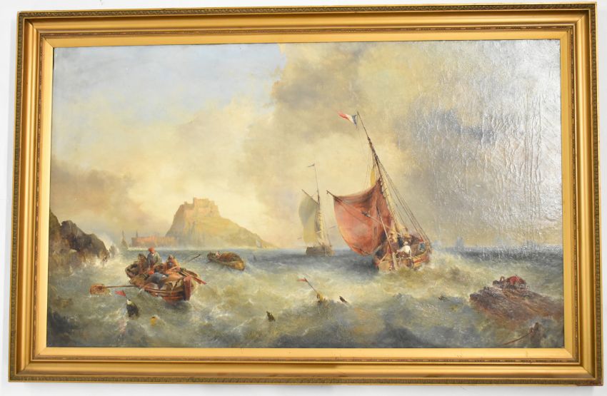 Alfred Montague (1832-1883) oil on canvas seascape, sailing and rowing boats in a choppy sea with castle on an outcrop ahead, signed lower left, 75 x 127cm