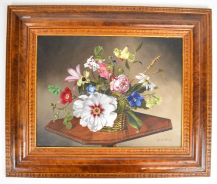 John Lancaster (1913-1984) oil on board still life basket of flowers on an octagonal table, signed and dated 1964 lower right, 34 x 45cm, in moulded wood frame