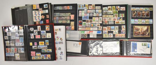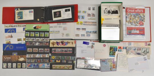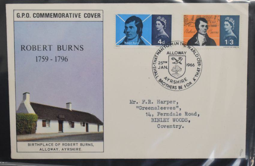 A collection of stamps and British and European first day covers. GB first day covers 1957-1991, 1950s and 60s covers with special postmarks including Scout Jamboree, six Sutton Coldfield slogan, 1958 Commonwealth Games with Cardiff Games slogan, 1958 regional stamps, 1963 FFH with Birmingham Freedom From Hunger slogan. 1963 Lifeboats with London Lifeboat Conference slogan. 1964 Shakespeare with Stratford pictorial postmark and presentation pack and Stratford ordinary FDI cancel. Selection of 1966 Burns with various postmarks. European first day covers to include Gibraltar, Netherlands and France. Album and stockbooks of all world stamps. Framed France 1992 Winter Olympics miniature sheet and postal stationery cards. Selection of GB presentation packs. World stamps including European, Commonwealth and Channel Islands