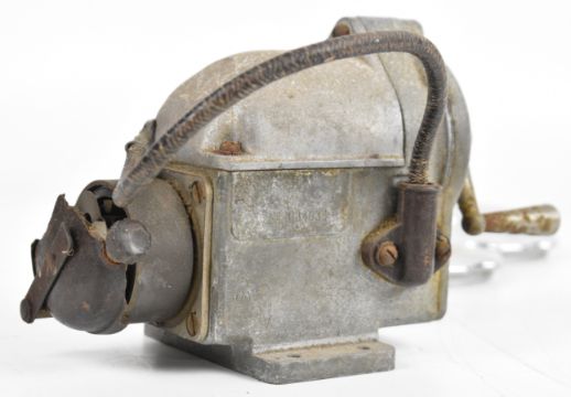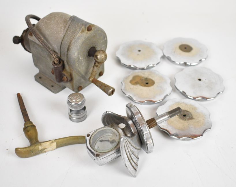 Vintage and pre-war car parts comprising a Wilmot-Breeden Calormeter with wings and radiator cap, five further radiator caps, door handle, dash light cover and a BTH AS-4 hand cranked aircraft starting magneto