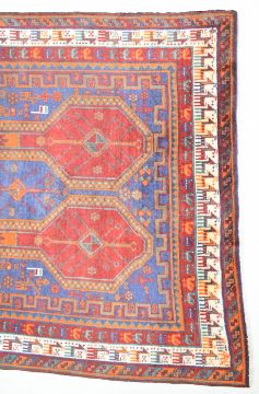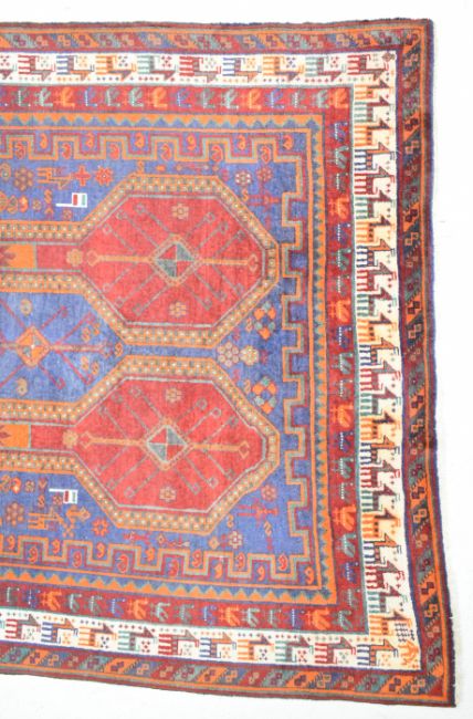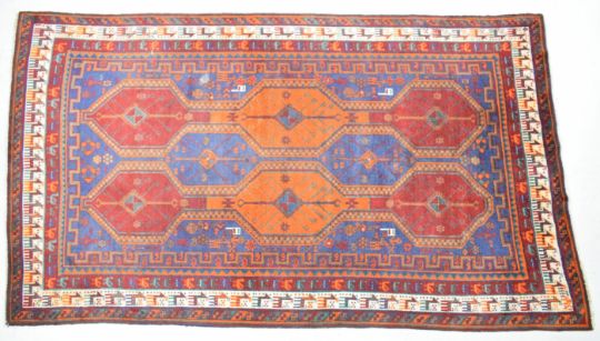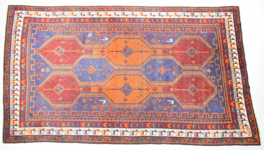 Turkoman rug with alternate blue, red and orange guls on a wine ground, within figural animal and geometric border, 270 x 156cm