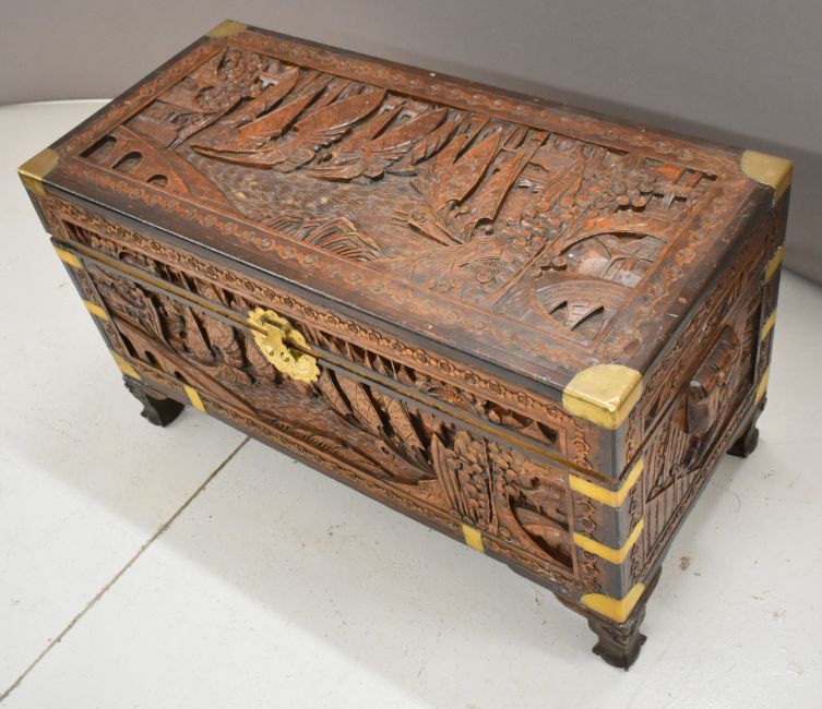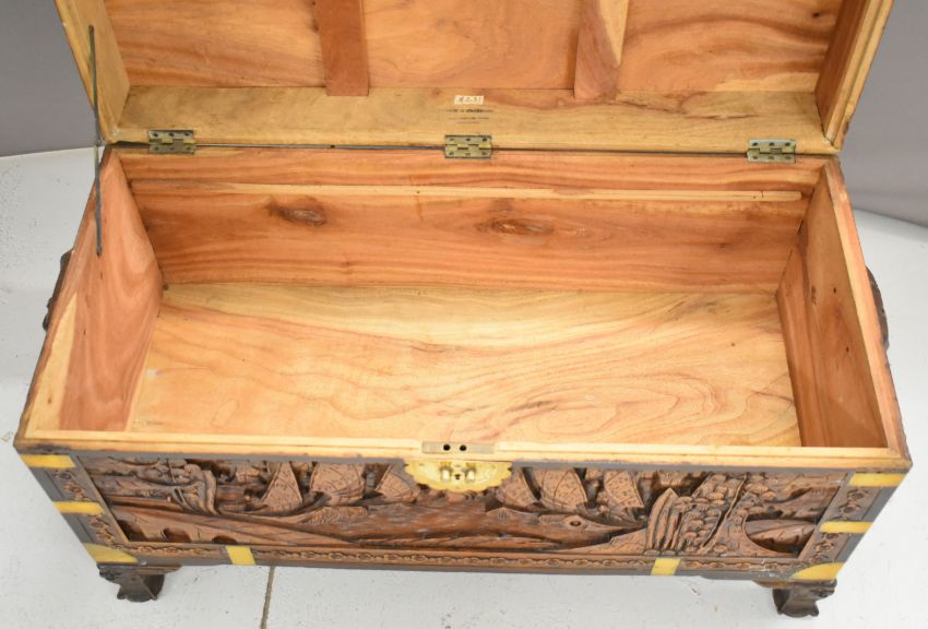 Chinese carved metal bound camphor wood chest, W94 x D45 x H55cm