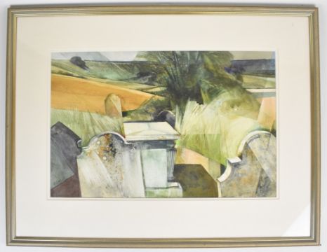 Peter L. Folkes (1923-2019) watercolour ‘From Chilcomb Church Yard’ with artist label on reverse, 34 x 52cm framed
