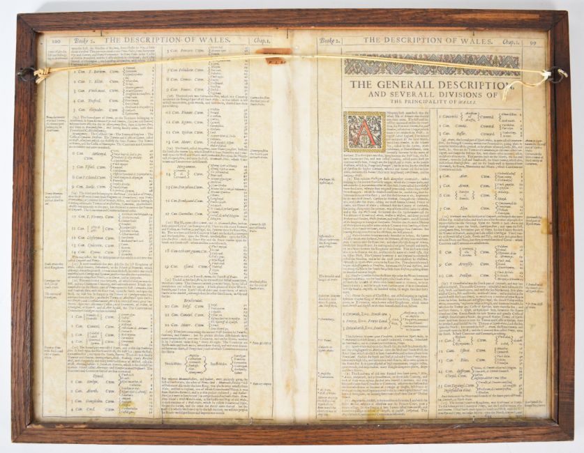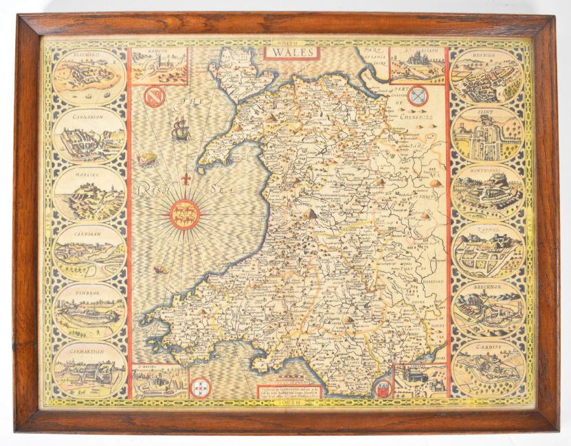 [Map] John Speed hand coloured engraved map of Wales, to be sold by John Sudbury and George Humble in Pope’s Head Allye 1610, illustrated with oval vignettes of the principle cites and towns to the vertical margins and inset views of the cathedrals at Bangor, St. Assaph, St. Davids and Llandaff, 39 x 51cm framed and with clear glazed reverse showing text pages 99 & 100 with the general description in English and with hand colouring to initial letter and engraved headpiece