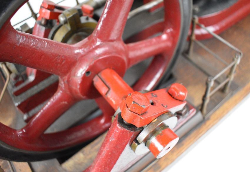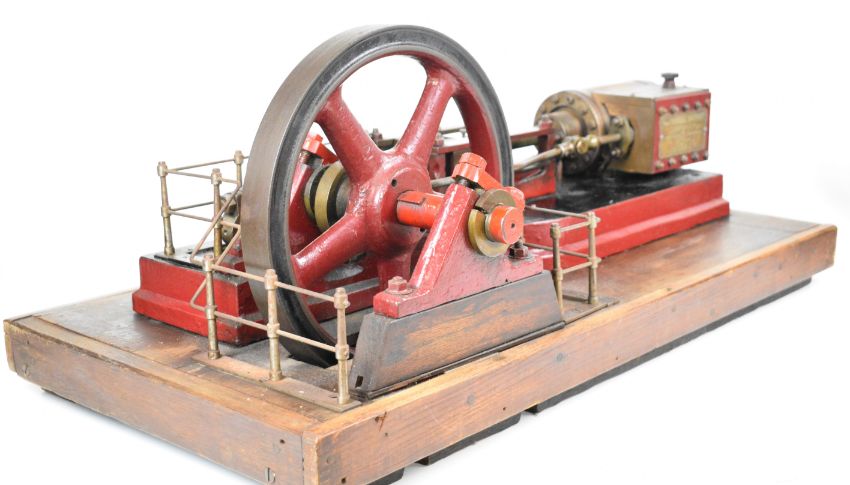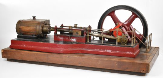Vauxhall Ironworks Company Ltd late 19th or early 20th century single cylinder live steam workshop or similar horizontal stationary engine, the wooden lagged cylinder having twin drain cocks, the slide bars with flip top oil cups and tapering connecting rod, driving a spoked 29.5cm flywheel, the valve chest having a brass plate for Vauxhall Ironworks Company Ltd, Mechanical & Electrical Engineers, London, S.W., this company was formed in 1896, made the first Vauxhall cars and in 1905 became Vauxhall Motors Limited, on an oak base, overall length 83cm