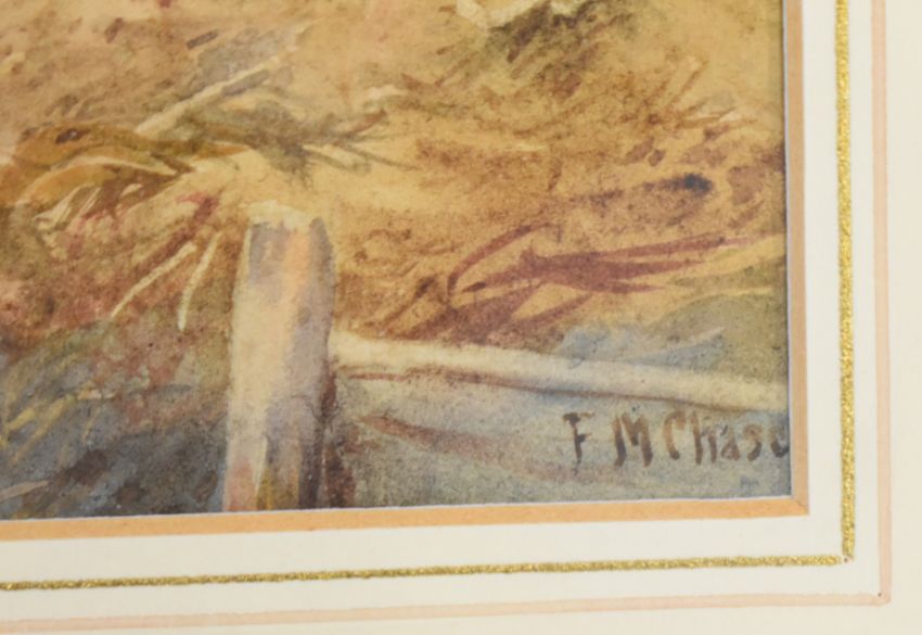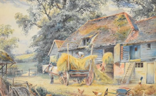 Frank M Chase (1843-1925) watercolour farmyard with a hay cart being unloaded, signed lower right, 25 x 38cm, in gilt frame