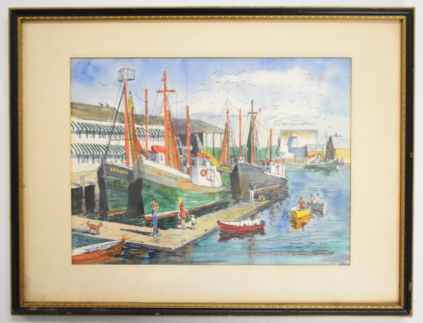 Watercolour fishing boats and figures in a harbour, indistinctly signed Fox, 22 x 29cm, in gilt and ebonised frame