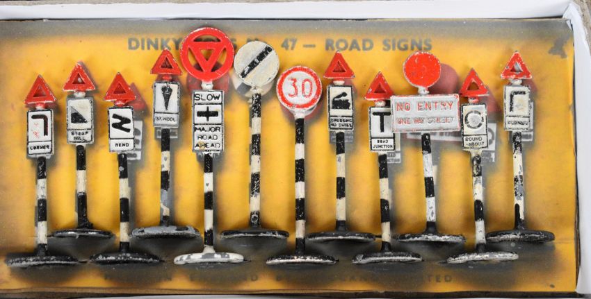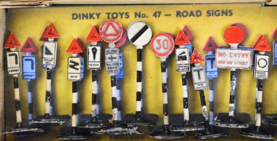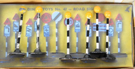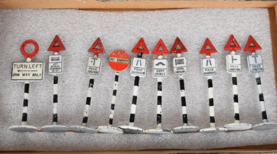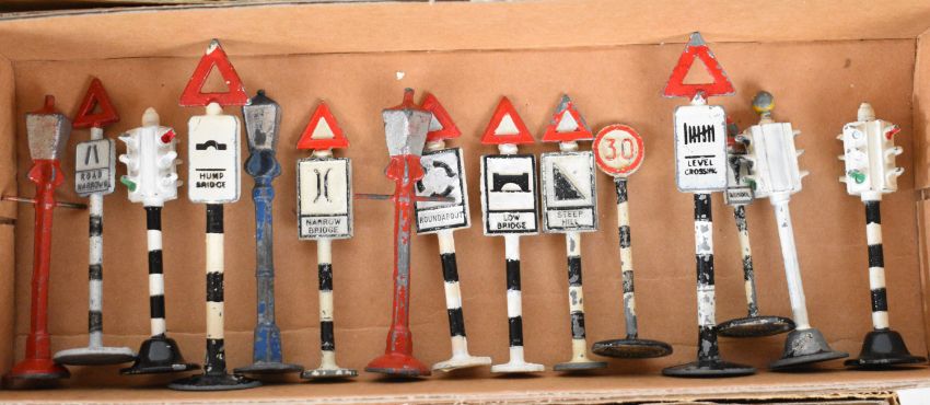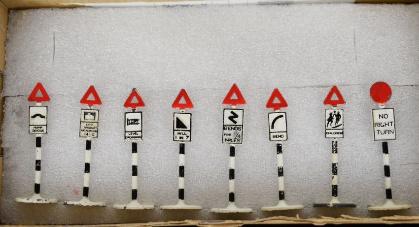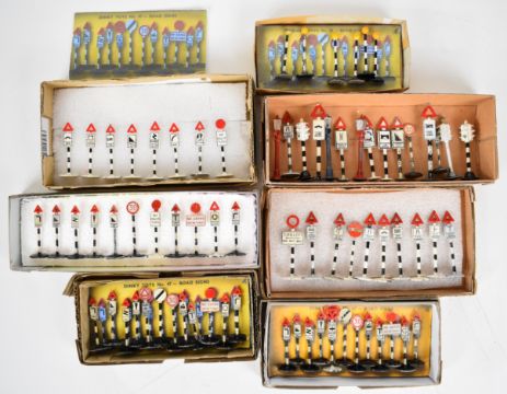 A collection of Dinky Toys British road signs and traffic bollards, grouped into sets.