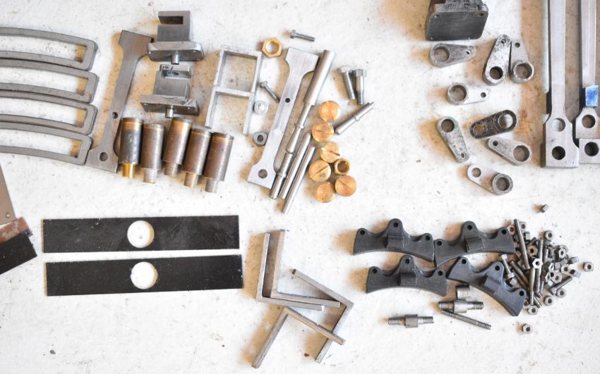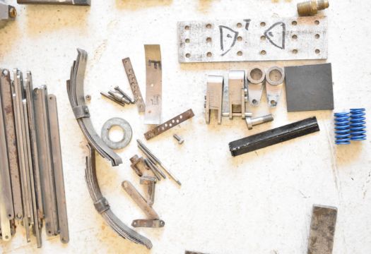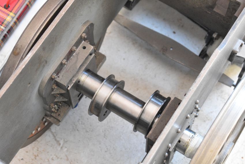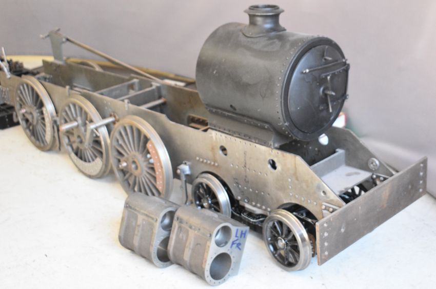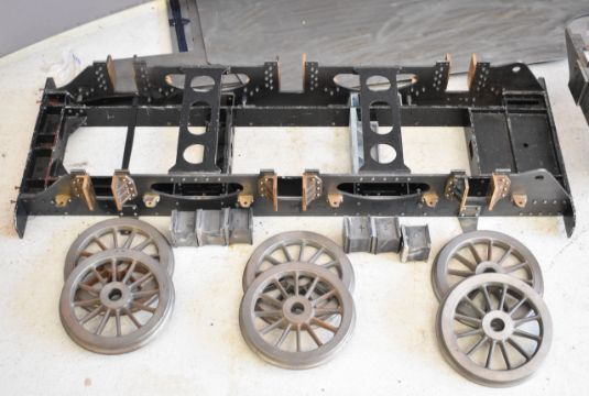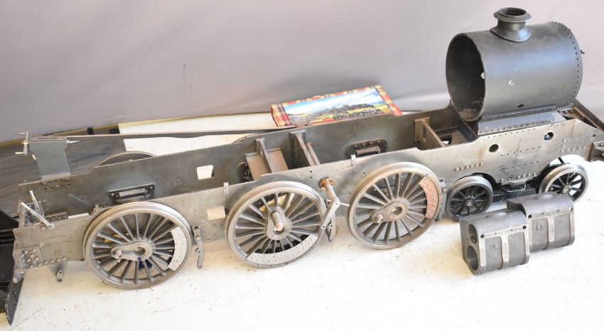 Part built exhibition standard 7¼ inch gauge Martin Evans Highlander 4-6-0 Black 5 live steam tender locomotive, to include chassis, axles, wheels, front bogie, smokebox, water pumps with eccentrics, reverser, connecting and coupling rods, brake cylinder, brake gear including shoes, tender chassis, wheels, and a pair of rotating build stands. This having been one of a pair that the vendor's late husband was mid build