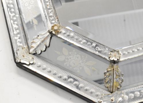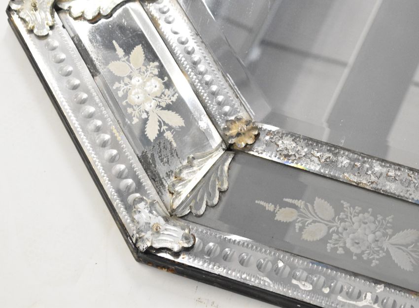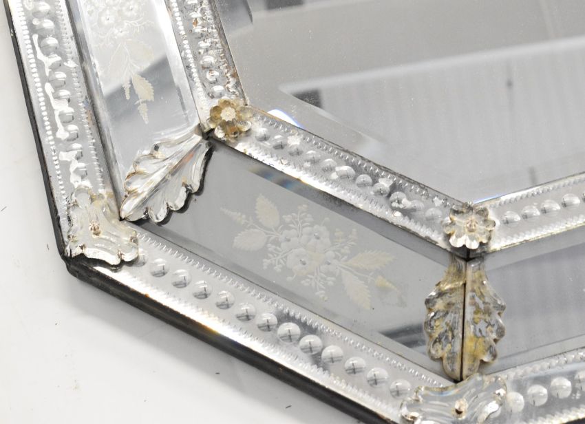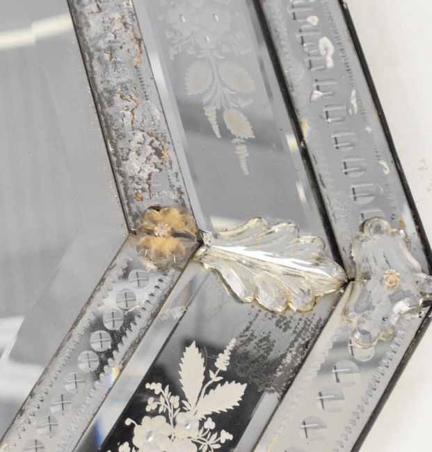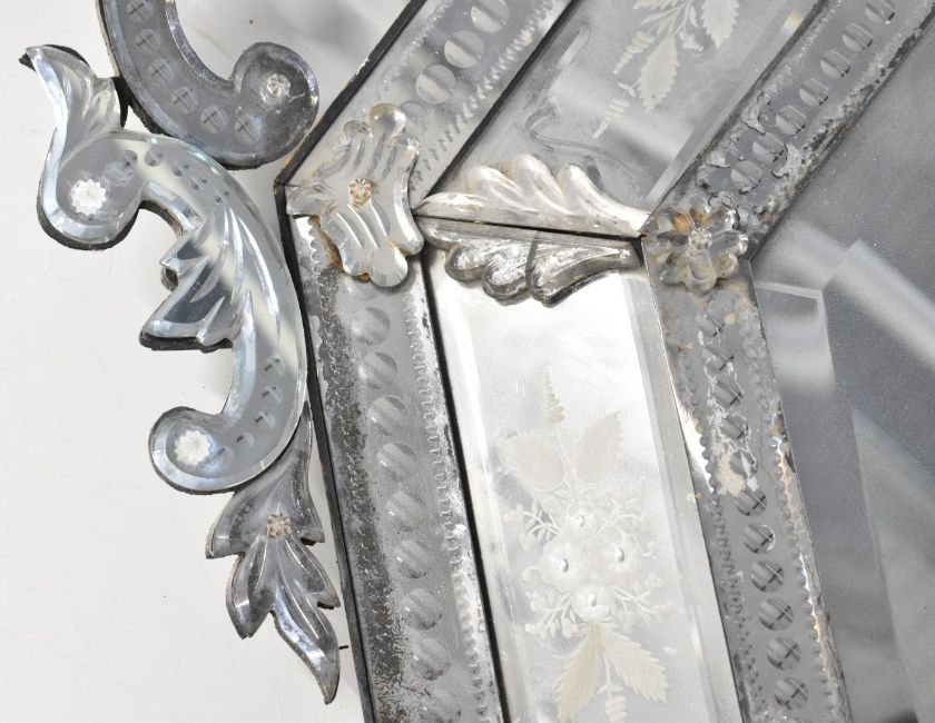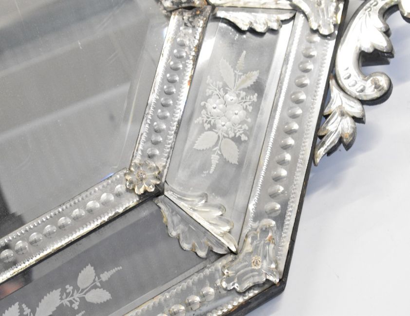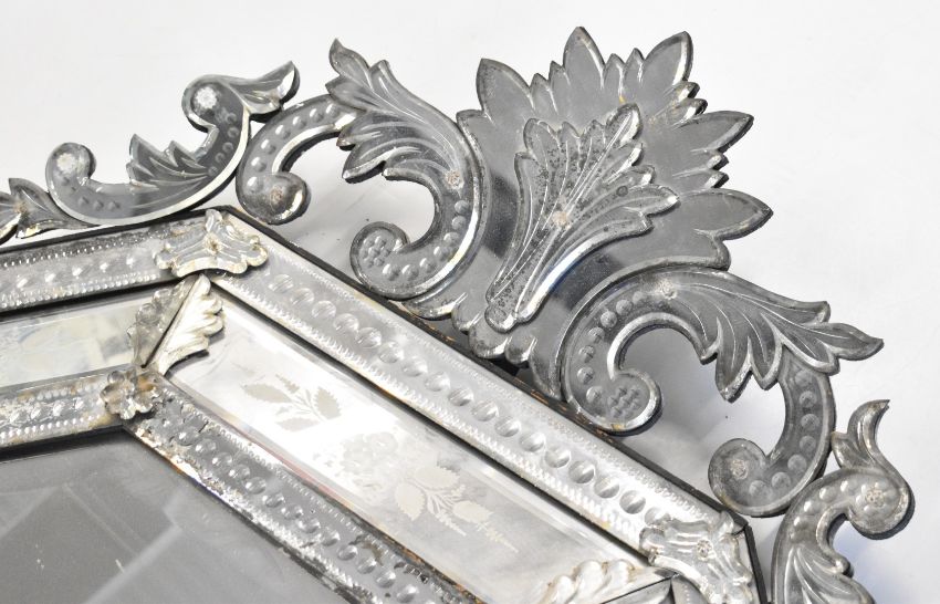 19thC Venetian bevelled and engraved cushion mirror with scrolling finial, W115 x H121cm