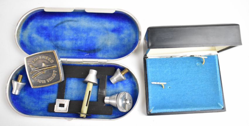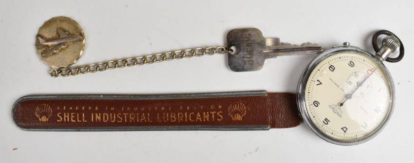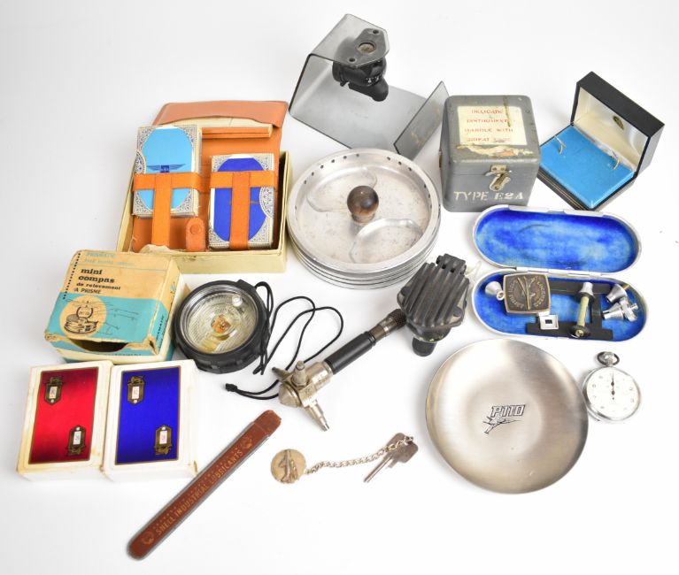 Aviation interest collectables to include Lemania stopwatch marked Rotol Ltd EF 53 to rear cover, Merlin or similar piston section, E2A cockpit compass, three further similar compasses, novelty presentation BOAC Boeing 747 G-AWNA silver key fob and key, Rolls Royce and Rotol playing cards and a Newall 3 - 3½ inch bore micrometer