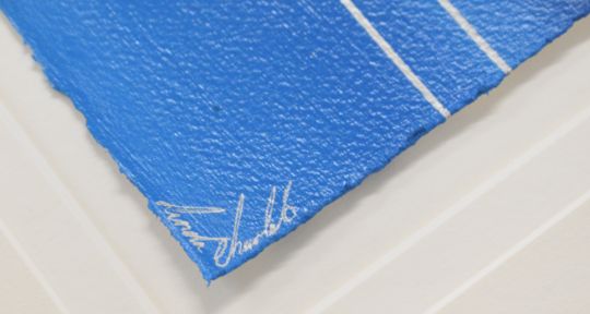 Linda Charles (b.1969) abstract mixed media, signed lower right, framed and glazed, 76 x 18cm, in silvered frame