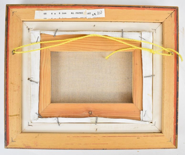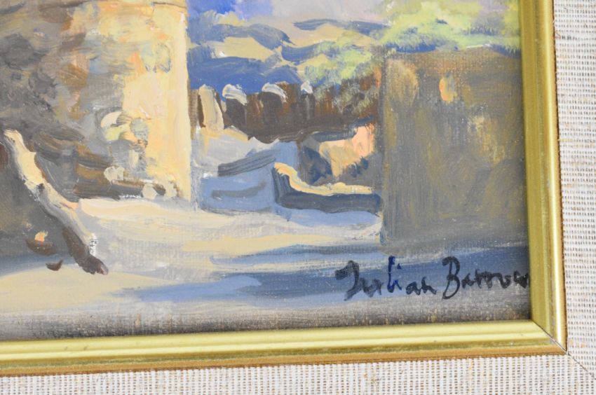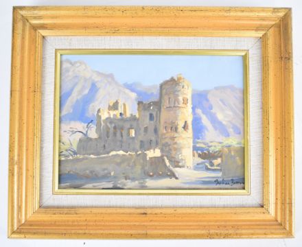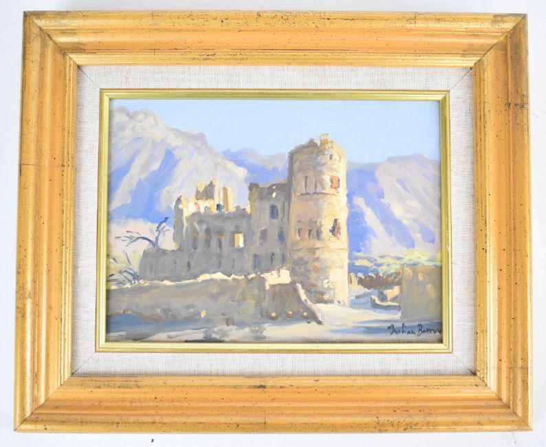Julian Barrow (1939-2013) oil on canvas Al Fateh Fort, Oman landscape with ruined turreted building to foreground, signed lower right 14 x 19cm, in gilt frame with title verso