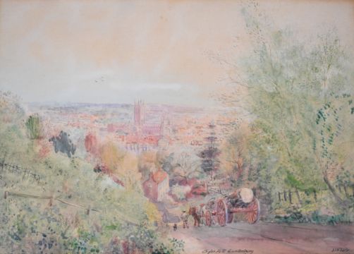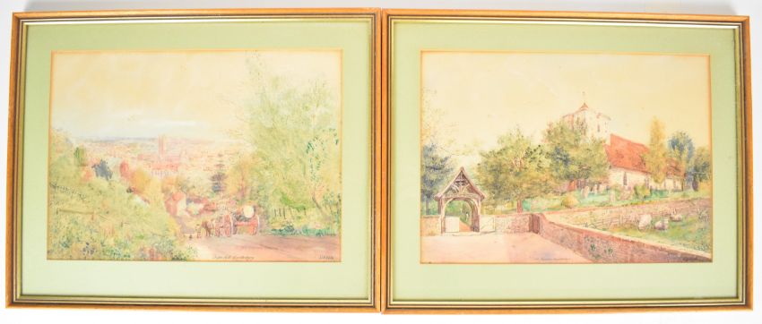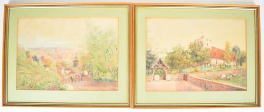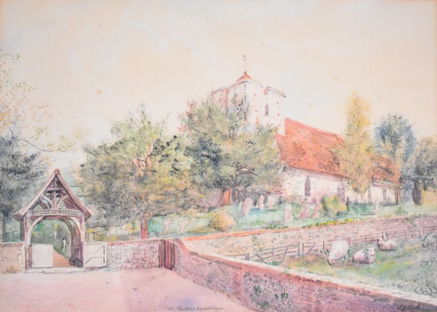 S.J. ‘Toby’ Nash (1891-1960) pair of ink and watercolours depicting St. Martins chuch and Tyler Hill Canterbury, both titled and signed in ink on bottom edge, 26.5 x 37cm framed  (2)