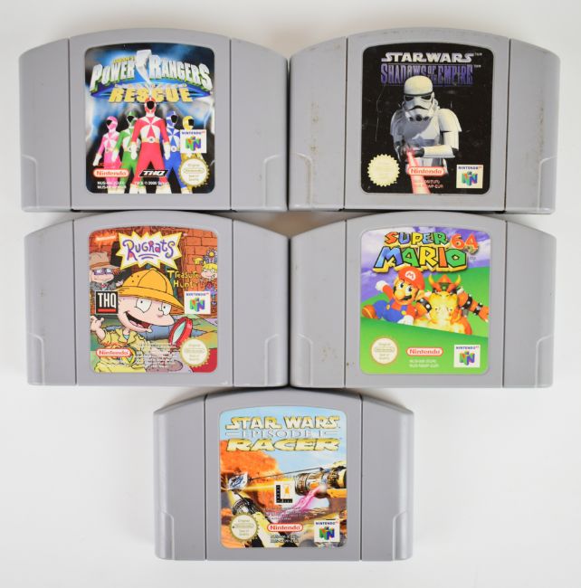Five Nintendo 64 (N64) games comprising Super Mario 64, Star Wars: Shadow of the Empire, Power Rangers Lightspeed Rescue, Rugrats Treasure Hunt and Star Wars: Episode I Racer.
