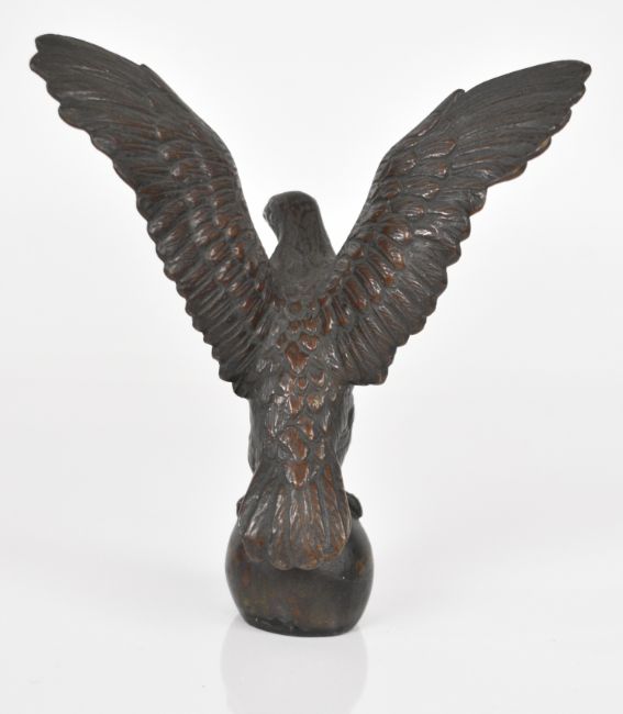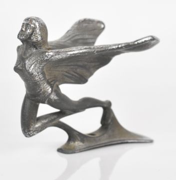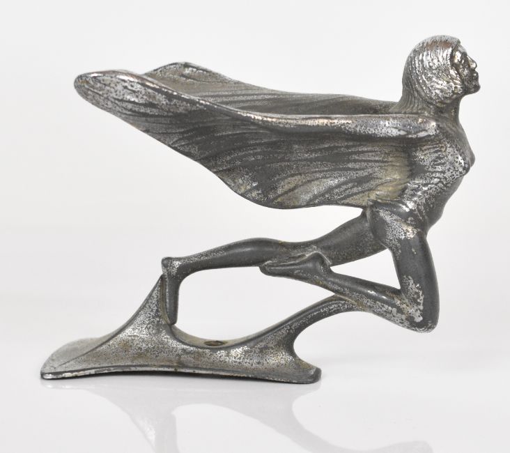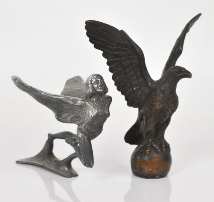 Bronze car mascot formed as an eagle on a ball, possibly Case, height 13.5cm, together with a chrome Art Deco style speed nymph mascot, similar to a Rolls Royce Spirit of Ecstacy